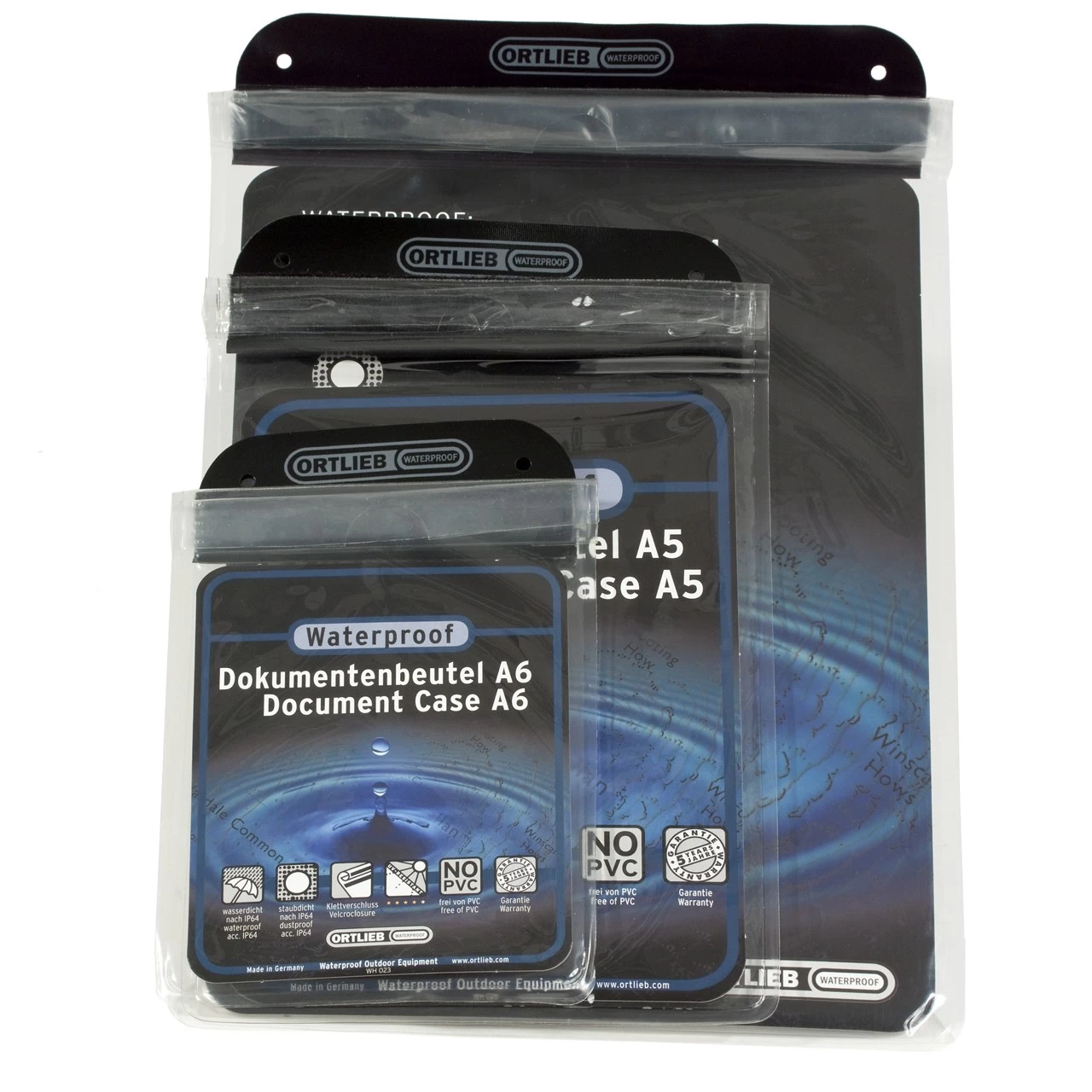 Wie bewahrt man unterwegs feuchtigkeitsempfindliche Sachen wie Landkarten Reiseführer, Reisedokumente und Schreibpapier auf? Im wasserdichten ORTLIEB DOKUBEUTEL, erhältlich in drei Formaten. Er besteht aus einer äußerlich sehr unscheinbaren Folie. Doch diese hat es in sich: sie ist enorm dehnbar, knick- und alterungsbeständig, widersteht Tropenhitze und Polarkälte und ORTLIEB hat ein Verfahren entwickelt, dieses Material adäquat zu verarbeiten. Die Festigkeit der Schweißnaht ist dem Material ebenbürtig. Die Handhabung ist einfach: zum Verschließen werden die Beutel am oberen Ende eingerollt und durch Klett fixiert. Unter längerer UV-Einstrahlung kann sich das Material der Kartentaschen und Dokumentenbeutel gelblich färben. Dies hat jedoch keinerlei Auswirkungen auf Funktion und Qualität des Materials. Alternative Materialien sind in anderen, wichtigen Eigenschaften schlechter.